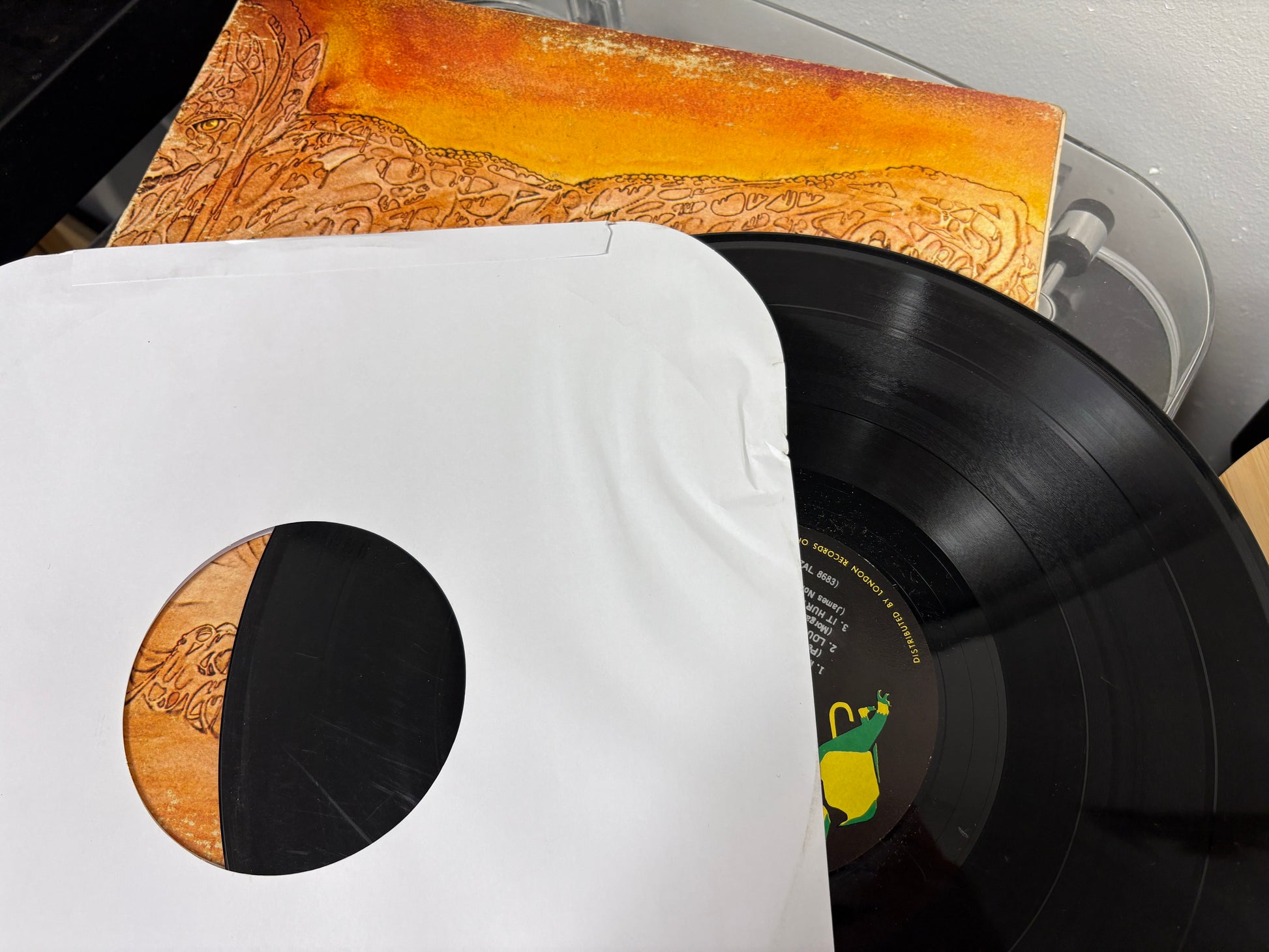 Cover is in fine condition, quite a bit worn down at the corners and the edges, small tear at the middle of the bottom. Inner design of the gatefold vinyl is in good condition. Inner sleeve is a paper replacement sleeve. Disc has some scratches throughout, plays just fine with some static.